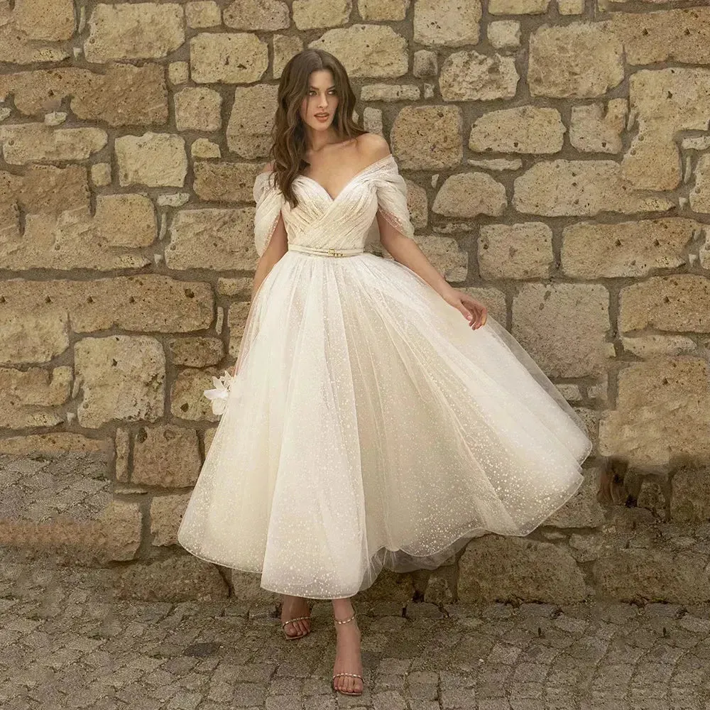 Bling Glitter Boho Wedding Dresses For Women Sweetheart Tulle Point Net Tulle Beach Short Bridal Gown Civil