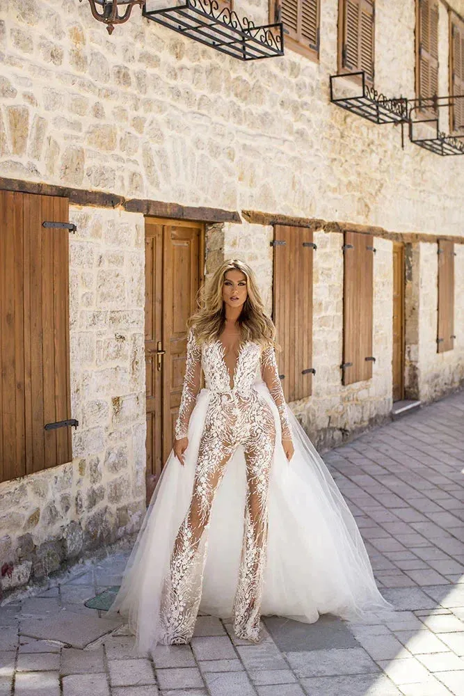 Lace Wedding Jumpsuit Wedding Dresses A-line Long Sleeves Tulle Boho Wedding Gown Bridal Jumpsuit Vestidos De Novia