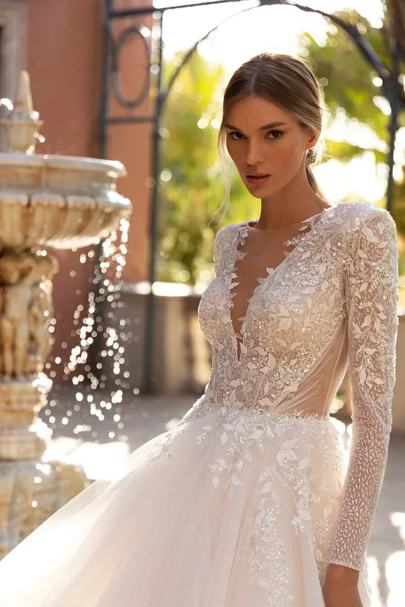 Shiny Lace Boho Wedding Dress A Line Long Sleeve Tulle Bridal Dresses Vintage Lace Wedding Gowns